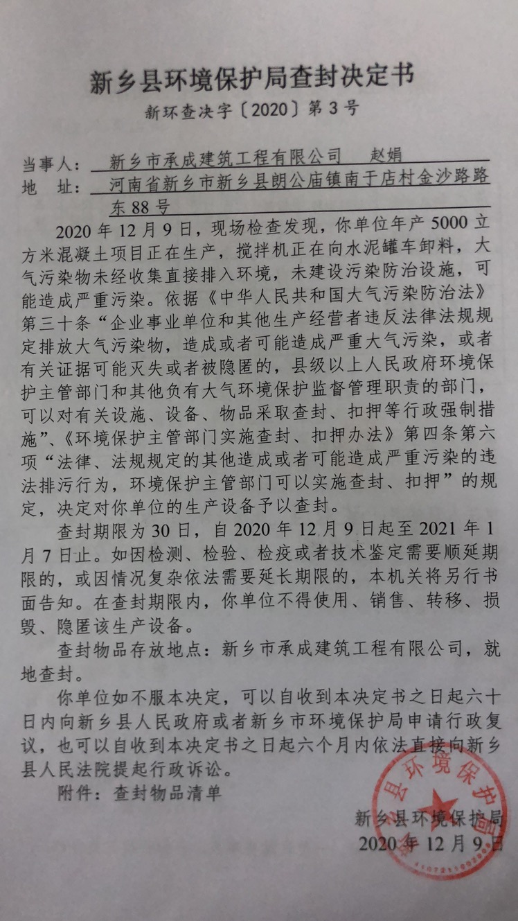 新环查决字〔2020〕第3号 新乡市承成建筑工程有限公司