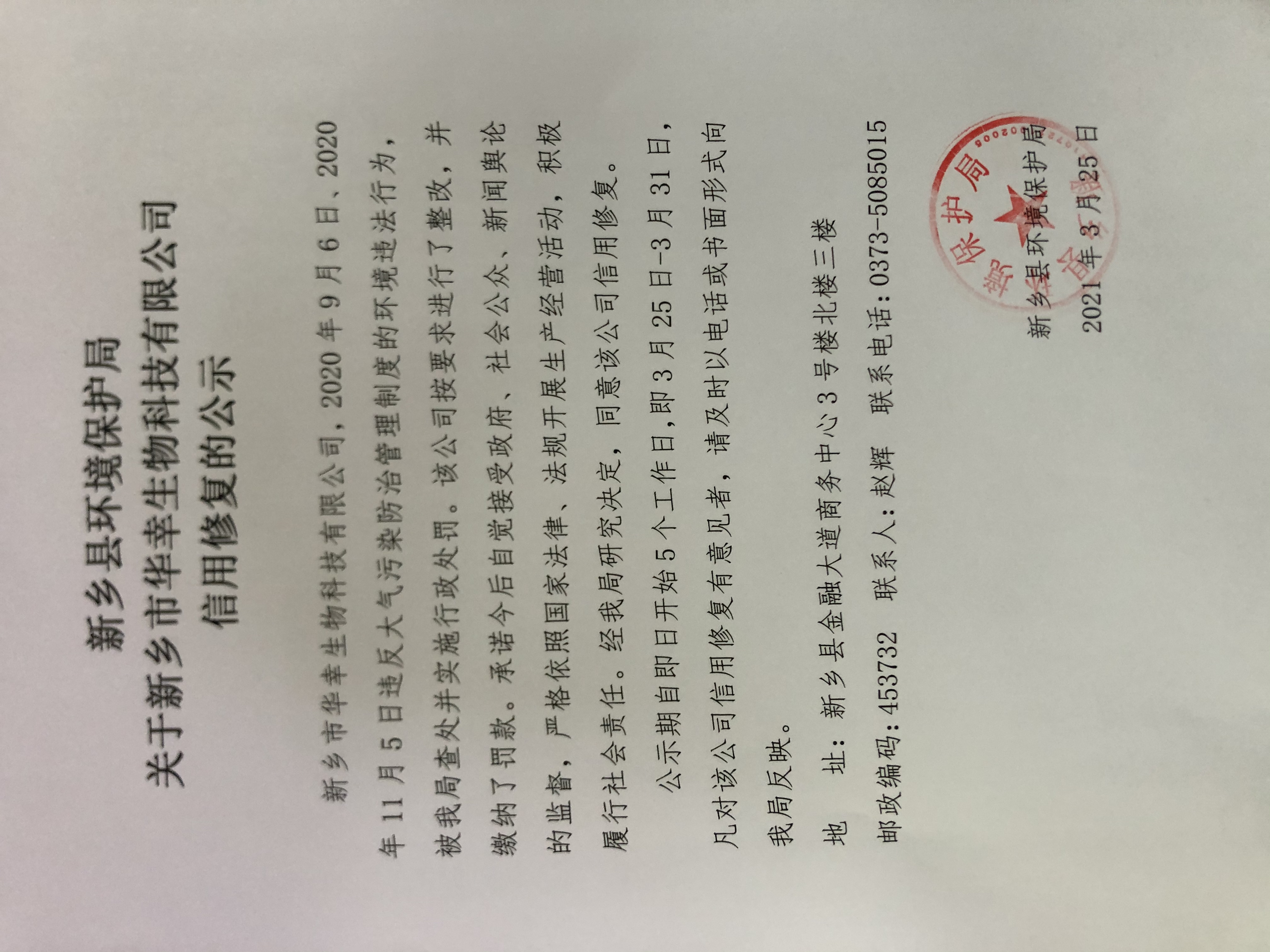 新乡县环境保护局 关于新乡市华幸生物科技有限公司信用修复的公示