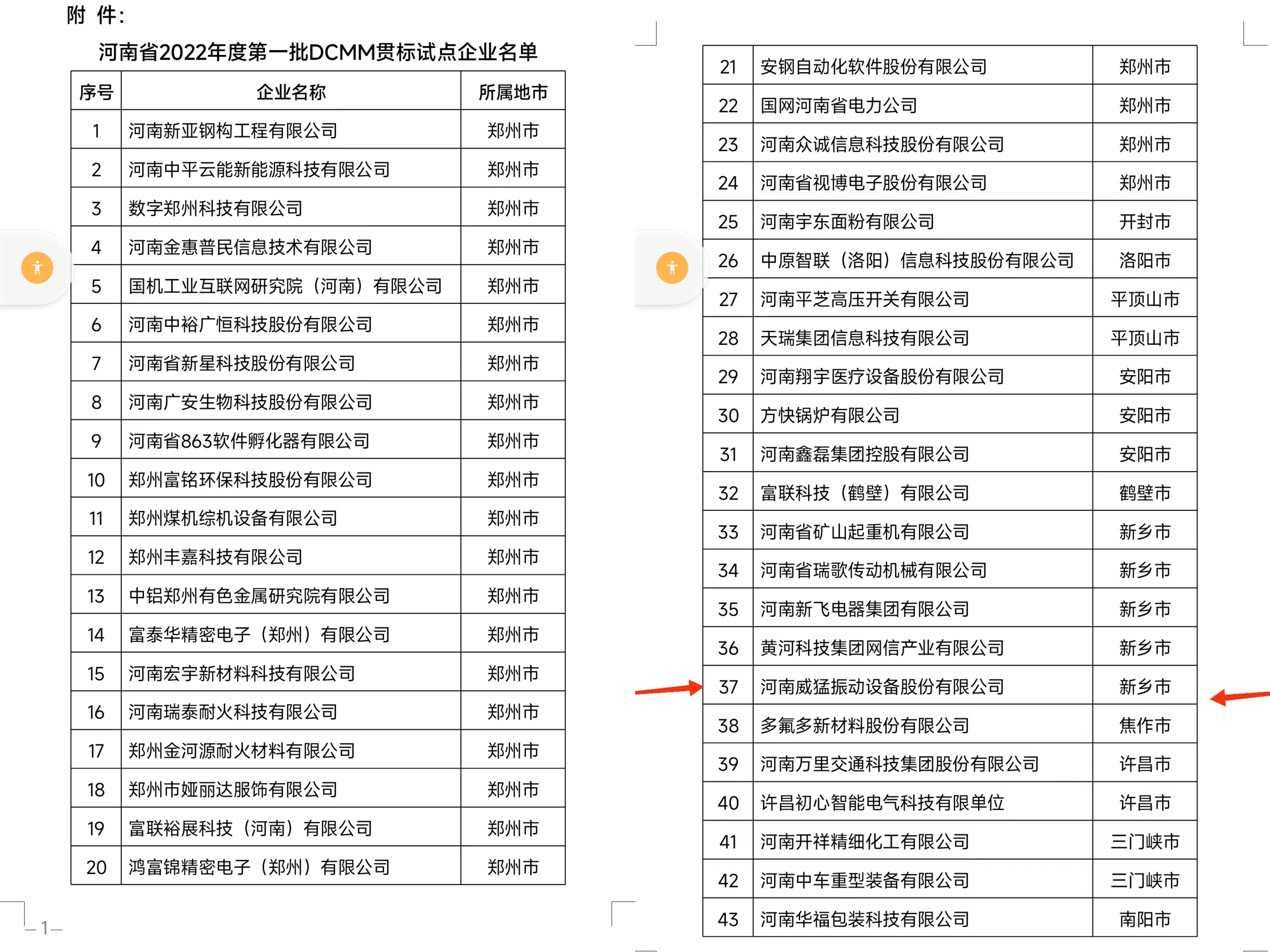 我县河南威猛振动设备股份有限公司进入河南省2022年度DCMM贯标试点公示名单