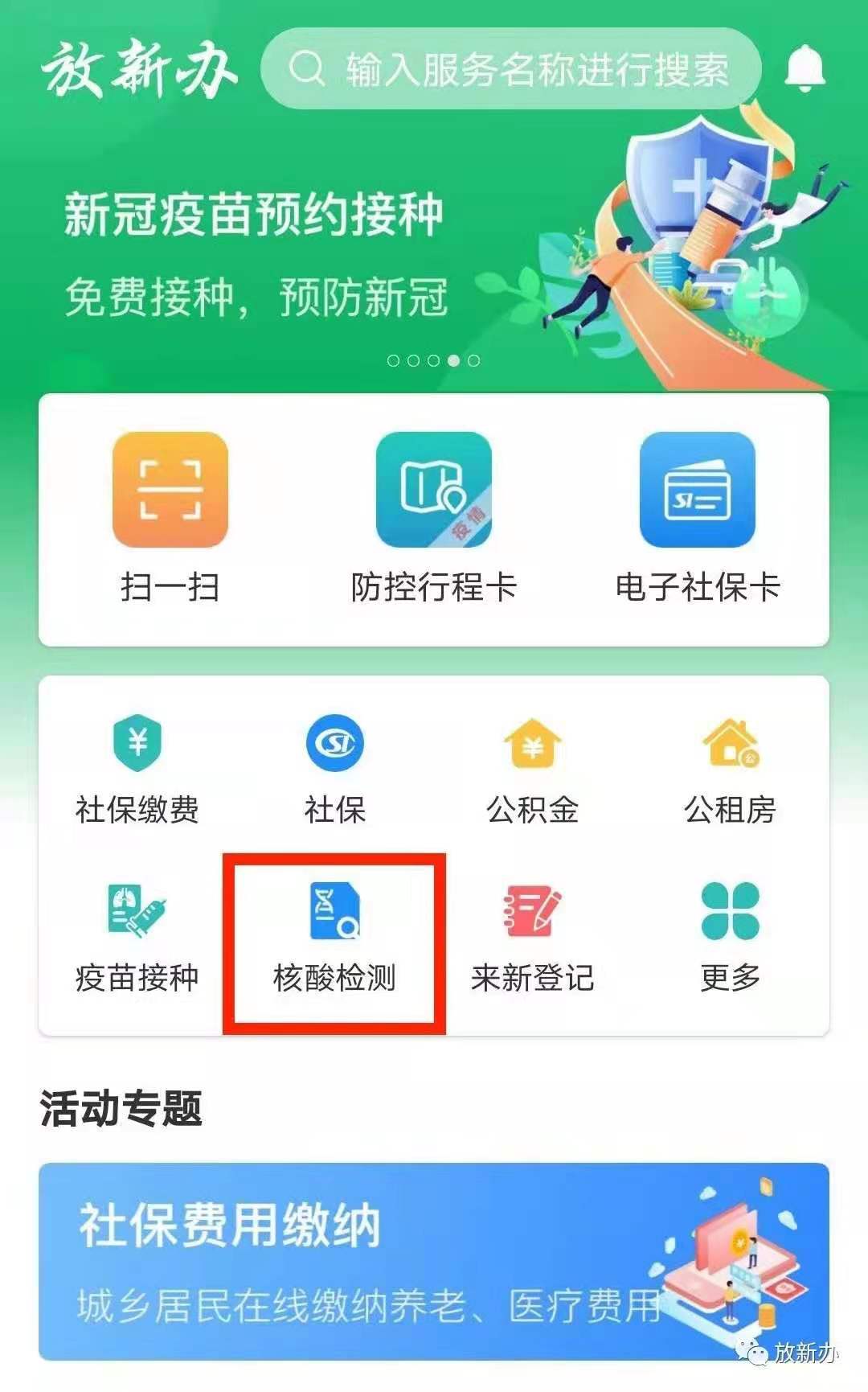 方法二:下载并登录新乡政务服务平台“放新办”APP,点击首页“核酸检测”查询结果。
