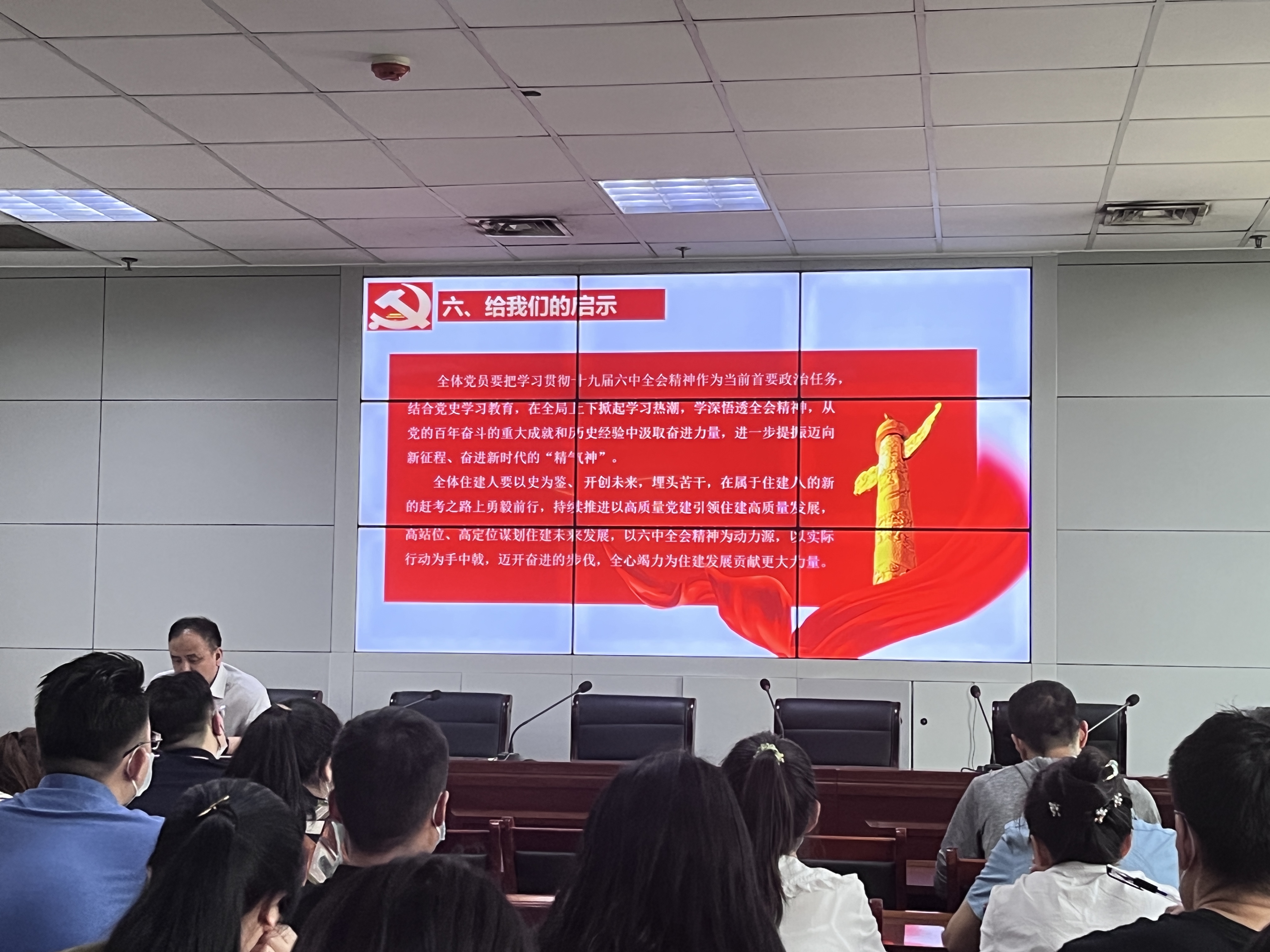 此次会议由住建局机关支部书记王鉴磊同志主持,会议通过六个方面系统性的向与会人员讲述十九届六中全会主要内容及其内在精神。六中全会是在建党百年之际召开的一次具有中重大历史意义的会议,全会树起了“五座丰碑”,实现了“三个需要”。并出台第三个历史《决议》,是郑重的历史性、战略性决策。专题学习会后王鉴磊同志表示:全体党员要把学习贯彻党的十九届六中全会精神作为当前首要政治任务,结合党史学习教育,在全局上下掀起学习热潮,学深悟透全会精神,从党的百年奋斗的重大成就和历史经验中汲取奋进力量,进一步提振迈向新征程、奋进新时代的“精气神”。
