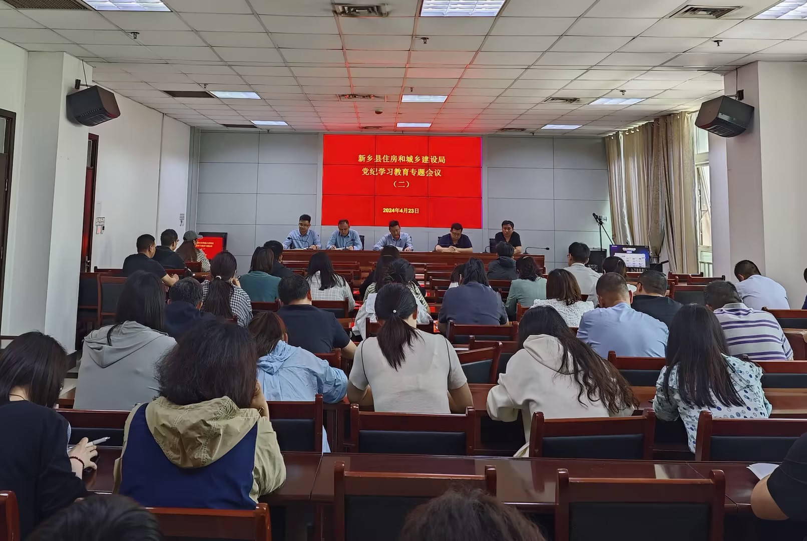 2024年4月23日,新乡县住建局召开第二期党纪学习教育工作会议,党组书记陈伟同志主持会议,科级干部及全体职工参会。会议集体观看了电视专题片《零容忍》。