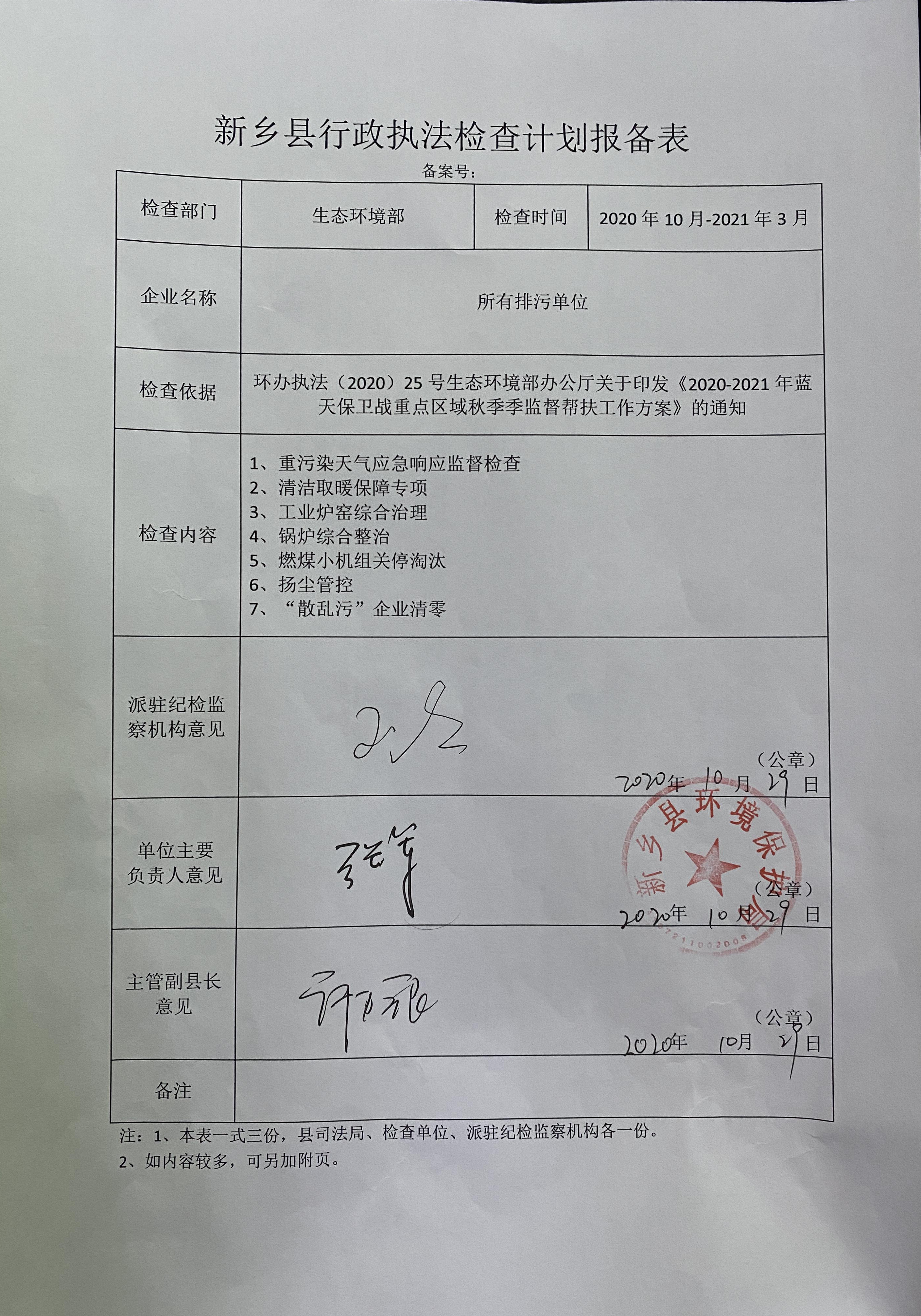 新乡县行政执法检查计划报备表