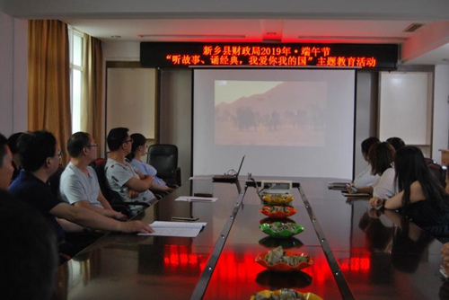 2019年6月5日下午,在端午节即将来临之际,为进一步增强干部职工的爱国情怀和爱岗敬业的热情,提高凝聚力,新乡县财政局积极举办“听故事、诵经典,我爱你我的国”主题教育活动,活动共分五个部分:一是歌唱祖国。由干部职工合唱《我和我的祖国》,用歌声唱出祖国与“我”之间的那种“大海与浪花”的关系,那种母与子的眷眷之情。二是听故事。通过观看视频的方式,了解爱国诗人屈原的生平事迹。三是学精神。利用这次活动,干部职工集中学习了习近平总书记关于爱国精神的重要论述。四是诵经典。通过诵读屈原的经典著作《国殇》,共同感受几千年以前屈原对祖国的那种爱国情怀。五是品粽子,话祖国,爱岗敬业永远有我。县财政局党组书记、局长张久强从吃粽子的由来开题,通过讲故事的方式要求广大干部职工要从自我做起,从小事做起,恪尽职守,爱岗敬业,为实现祖国繁荣富强贡献力量,为实现伟大中国梦贡献奋斗不止。