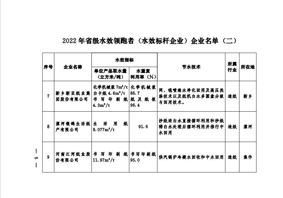 根据《河南省工业和信息化厅 河南省水利厅 河南省发展和改革委员会 河南省市场监督管理局 关于公布2022年重点用水企业、园区水效领跑者的通知》豫工信联节【2022】120号文件,确定了新乡新亚纸业集团股份有限公司为省级水效领跑者。