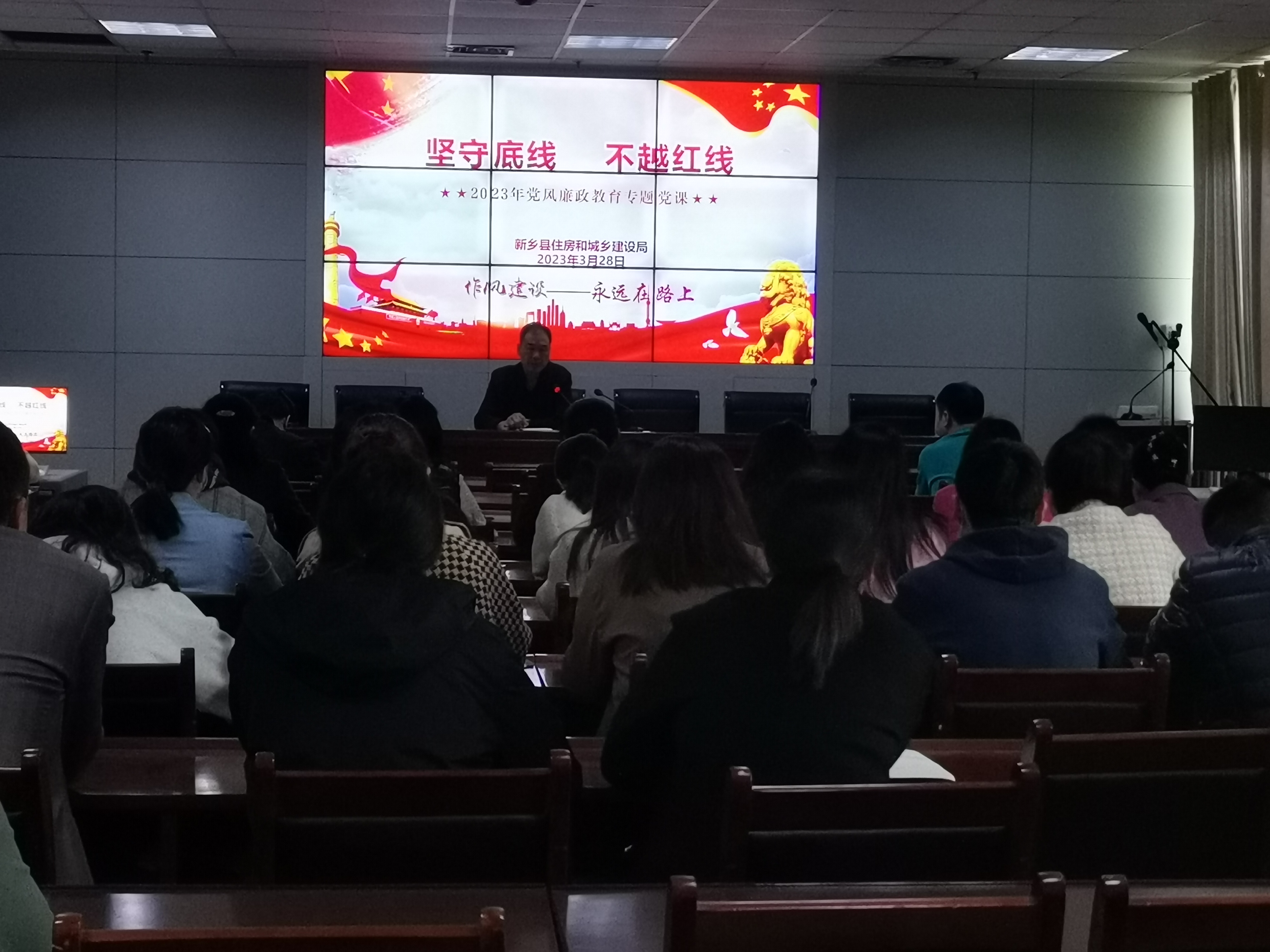 新乡县住建局把开展讲党课活动作为党史学习教育的一项重要举措进行安排部署,通过讲党课活动宣传党的政策,传达党的声音,推动党的二十大精神入脑入心,走深走实。2023年3月28日,新乡县住建局局党组书记、局长岳国有同志走上讲台,开展“坚守底线,不越红线”党风廉政教育专题党课。